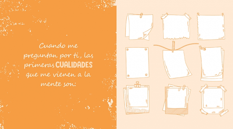 El libro perfecto para dar las gracias a quien más quieres. Para ________ Este libro es para ti porque todo lo que hay escrito en él habla de ti. En estas páginas encontrarás pedacitos tuyos que he ido descubriendo a medida que nos hemos ido conociendo. Eres una persona increíble, que hace cosas maravillosas. Realmente no hay otra persona como tú en el mundo, eres única. Aquí están nuestros recuerdos de viajes, historias y momentos compartidos. Este libro es para darte las gracias por ser tú y por dejarme formar parte de tu vida. Con amor,___________ · Un libro ideal para regalar a quien tú quieras en ocasiones especiales: cumpleaños, amigo invisible, Navidad, etc. · Totalmente personalizable e interactivo: podrás escribir anécdotas, recuerdos de viajes, historias, momentos compartidos, frases especiales... para hacer un regalo único.