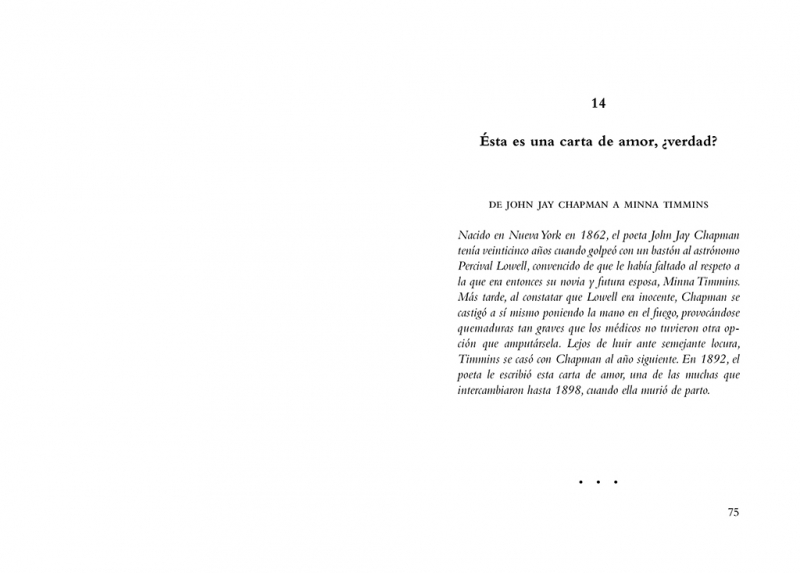 Cartas memorables es una celebración del poder de la correspondencia tradicional que capta, con un humor e ingenio, las grandezas y las miserias de nuestras vidas. Desde tiempos inmemoriales hasta finales del siglo XX, las cartas fueron el medio por excelencia de que disponían las personas para expresar sus ideas, razones y sentimientos. Shaun Usher, auténtico «arqueólogo» de la comunicación epistolar, ha reunido en este librito conmovedor algunas de las misivas más románticas, líricas, trágicas y divertidas de los últimos dos siglos sobre el amor. Desde los primeros aleteos pasionales y los placeres de la carne hasta los reproches y los sentimientos no correspondidos, una lectura deliciosa que expone sin rubor la amplia y variadísima gama de recursos disponibles para gestionar los asuntos del corazón. Con cartas de Simone de Beauvoir, Ludwig van Beethoven, Napoleón Bonaparte, Jorge Luis Borges, Johnny Cash, Frida Kahlo, Nelson Mandela, Vladimir Nabokov, John Steinbeck y Evelyn Waugh, entre otros.
