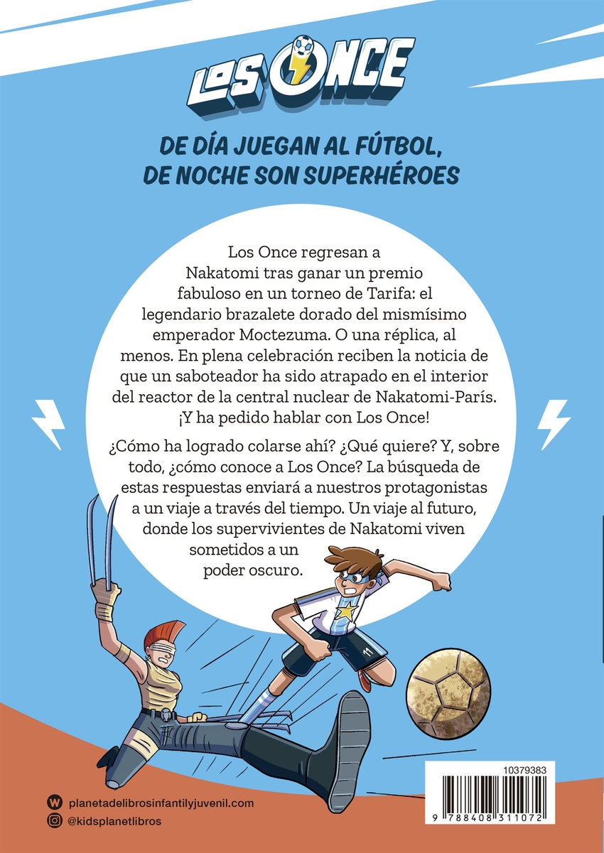 Los Once regresan a Nakatomi después de conseguir un premio fabuloso en un torneo de Tarifa: el legendario brazalete dorado del mismísimo emperador Moctezuma. O una réplica, al menos. En plena celebración llega la noticia de que un saboteador ha sido atrapado en el interior del reactor de la central nuclear de Nakatomi-París. ¡Y ha pedido hablar con Los Once! ¿Cómo ha logrado colarse ahí ¿Quién es ¿Qué quiere Y sobre todo ¿Cómo conoce a Los Once ¡Una cosa es conocer al Estrella Polar y otra cosa es conocer a «Los Once»! La búsqueda de esta respuesta enviará a nuestros protagonistas a un viaje a través del tiempo. Un viaje al futuro, donde los supervivientes de Nakatomi viven sometidos a un poder oscuro. ¿Por qué leer Los Once Historias que divierten y enganchan. Superhéroes, futbol, humor, aventura y amistad. Una narrativa que forma en valores. Historias autoconclusivas. Posibilidad de seguir leyendo las otras colecciones de Superhéroes. Una serie perfecta para los fans de: Los Gamers Piratas Las Princesas Rebeldes Escuadrón K Géneros Acción y aventura Misterios y superhéroes Empoderamiento y cómic Humor y diversión Deporte Descubre el universo de Superhéroes de Roberto Santiago