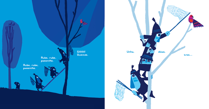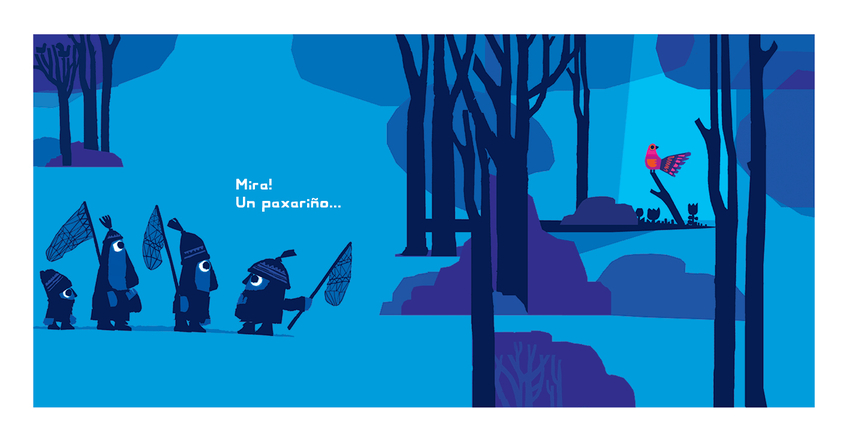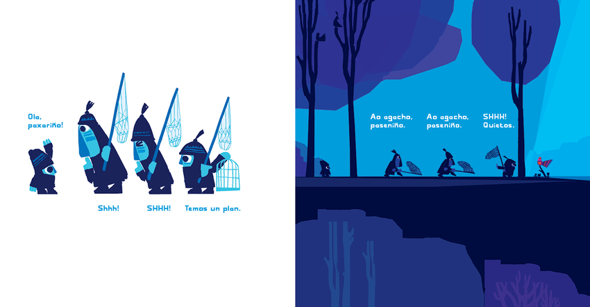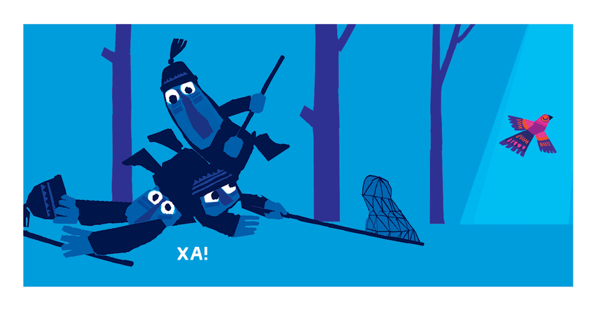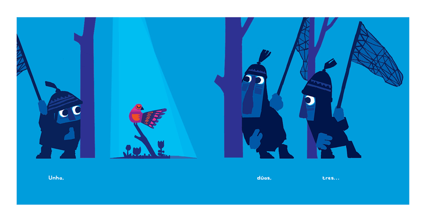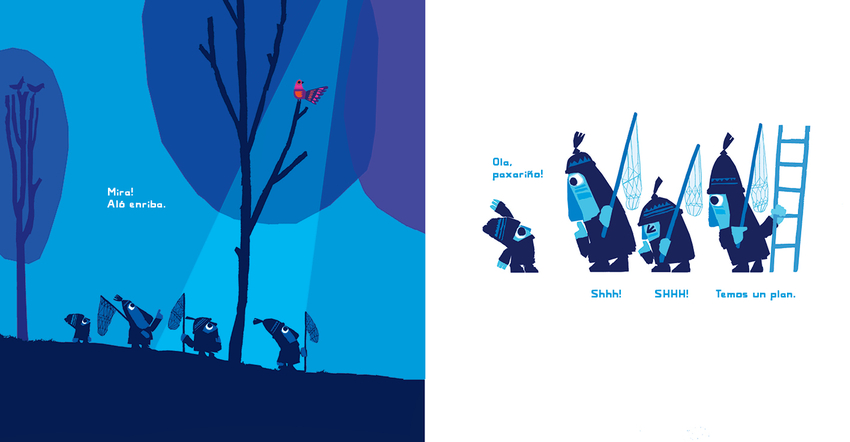 Catro personaxes camiñan polo bosque cun apañabolboretas na man. Cando ven un paxariño, comezan a moverse amodiño e sen faceren ruído. Shhhh! Temos un plan!