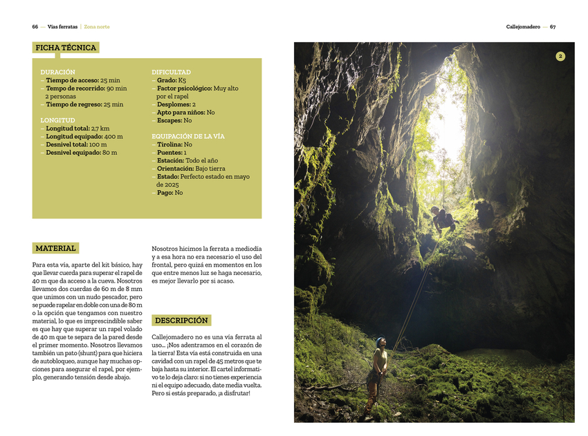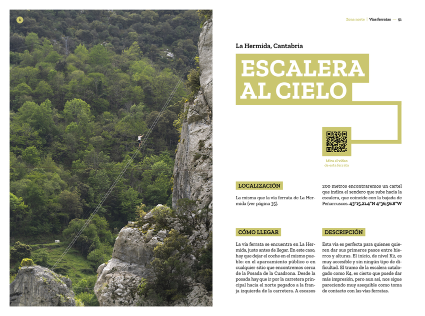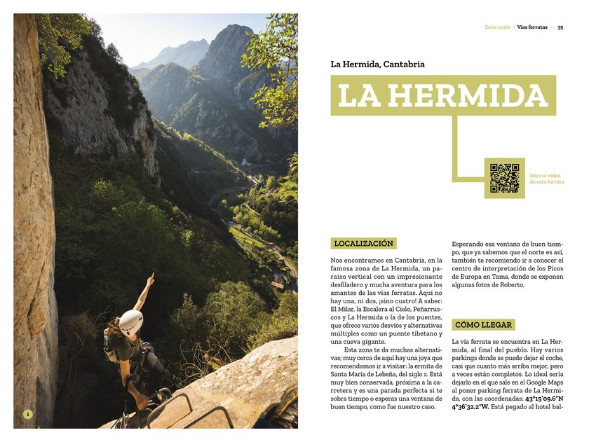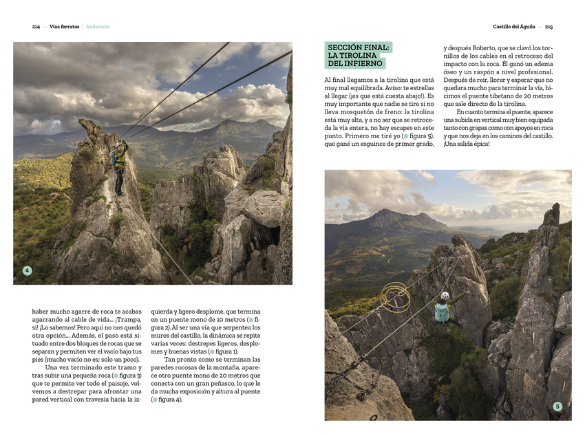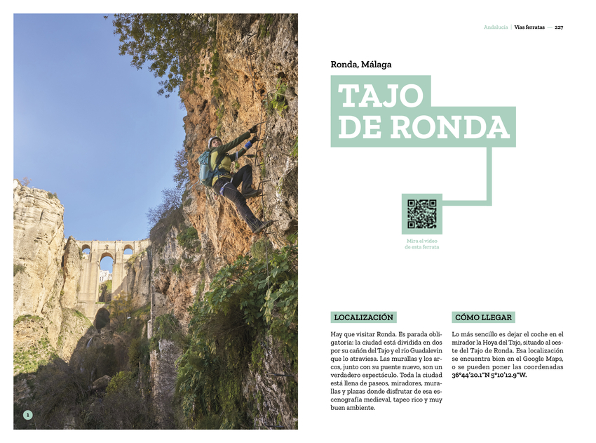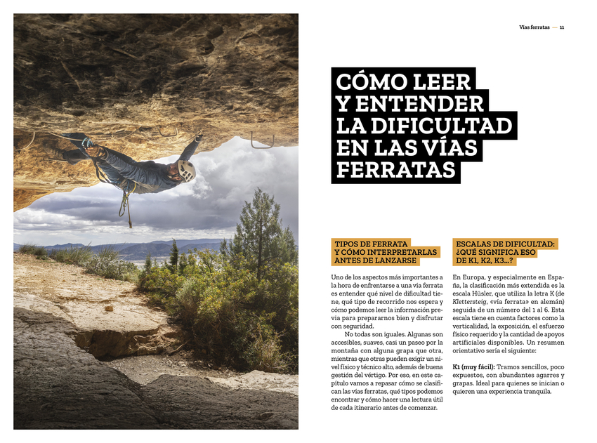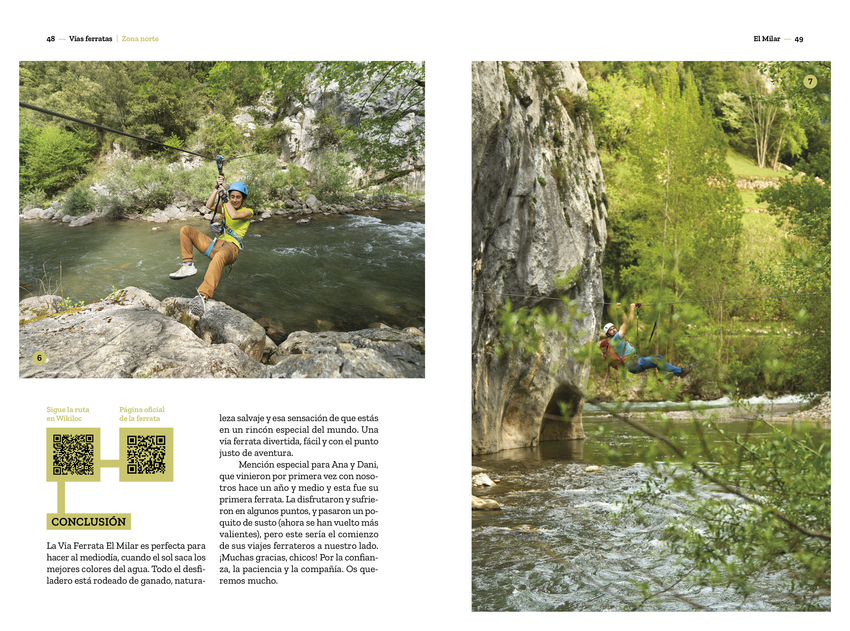 Las vías ferratas nacieron con la necesidad de mover las tropas por el norte de Italia durante la Segunda Guerra Mundial, y también como rutas de evasión de civiles hacia Austria, atravesando las impresionantes montañas de los Dolomitas. Hoy en día son una forma de acercar las paredes a los montañeros que, sin tener experiencia en el mundo de la escalada, quieren vivir las montañas desde otro lugar, sintiendo la adrenalina que ofrece el mundo vertical en un entorno un poco más controlado. Miriam Lorenzo González y Roberto Iván Cano han pasado casi dos años recorriendo España a través de sus vías ferratas y, después de haber probado la amplia oferta nacional, han hecho una pequeña selección entre las más variadas, divertidas y espectaculares. Hay propuestas para todos las edades y niveles. Además de detallados textos, el libro incluye espectaculares fotografías y códigos QR que enlazan con vídeos realizados por los autores para que podáis disfrutar de cada vía antes de viajar. Son muchos los aprendizajes y las anécdotas que se cuentan en estas páginas, pero no solo por las ferratas, también por la compañía y los lugares descubiertos. Porque la función de estas vías no es solo liberar el estrés acumulado a lo largo de la semana; de algún modo, este libro permite acercar los puntos menos calientes, turísticamente hablando, a un público que de otra forma no conocería las pequeñas joyas de nuestra geografía. Esa es la misión encubierta tras estos entramados de hierro: salir de las aglomeraciones turísticas y encontrar, en sus alrededores, la magia de su gente, su arquitectura y su gastronomía. Ha llegado el momento de hacer las mochilas, cargar todos los juguetes y recorrer los caminos que serpentean a través de la montaña dejando el suelo atrás. ¡No olvides mirar abajo!