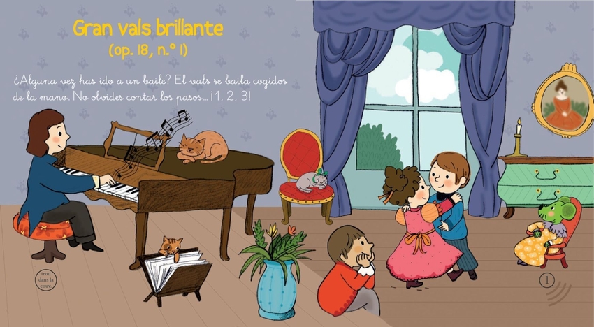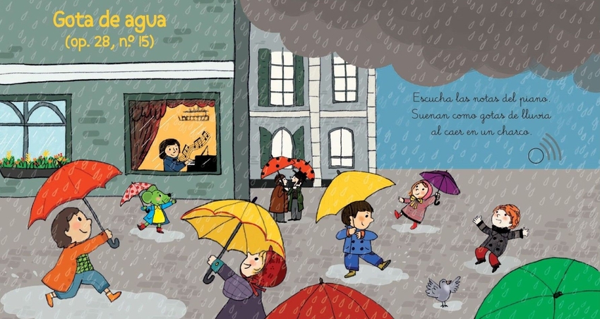 Cada ilustración de este libro esconde un botón que hará sonar melodías de música clásica de Chopin. El sonido de calidad y las preciosas ilustraciones hacen que esta colección de libros de sonidos no pare de crecer.¡Mi primer libro de sonidos para descubrir a Frédéric Chopin! En cada doble página encontrarás un botón que hará sonar un fragmento de una obra de música clásica. ¡Deja volar la imaginación con el mágico sonido del piano! Una alegre ilustración acompaña cada melodía y hace que este recopilatorio de 6 composiciones de Chopin, especialmente pensado para los más pequeños, sea único. Este libro contiene las melodías Gran vals brillante, Polonesas, Vals del minuto, Gota de agua, La mariposa y Nocturnos. Mientras escucháis las melodías, podréis deleitaros con las imágenes. Las ilustraciones de este libro están inspiradas en la Europa del siglo xix, el escenario que vio nacer la música de Chopin. Podréis encontrar desde elegantes calles adoquinadas hasta relajantes parques repletos de color. En cada uno de estos paisajes se encuentra el compositor, junto a su inseparable piano, observando la belleza de la escena en busca de inspiración. Una manera de introducir la música clásica desde la primera infancia y despertar el oído y la sensibilidad musicales. Este libro musical es de cartón resistente, y los botones tienen el tamaño ideal para manos pequeñas, de manera que puedan disfrutarlo de manera autónoma. Recomendado a partir de 1 año. Ilustrado por Séverine Cordier Títulos de la colección de música clásica: Mi primer concierto de música clásica. Luces y sonidos Mis primeras canciones de música clásica. Luces y sonidos Mis primeras compositoras Mi primera historia de la música clásica Mis primeros instrumentos de música clásica Mis primeras óperas Mis primeras melodías clásicas Mi primer Carnaval de los animales Mis animales de la música clásica Mis primeras melodías para bebés Mis primeras canciones para bailar Mis primeras nanas Mis primeras canciones en inglés Mis melodías clásicas de Navidad Mis melodías jazz de Navidad Mi primer Beethoven Mi primer Mozart Mi primer Vivaldi Mi primer Bach