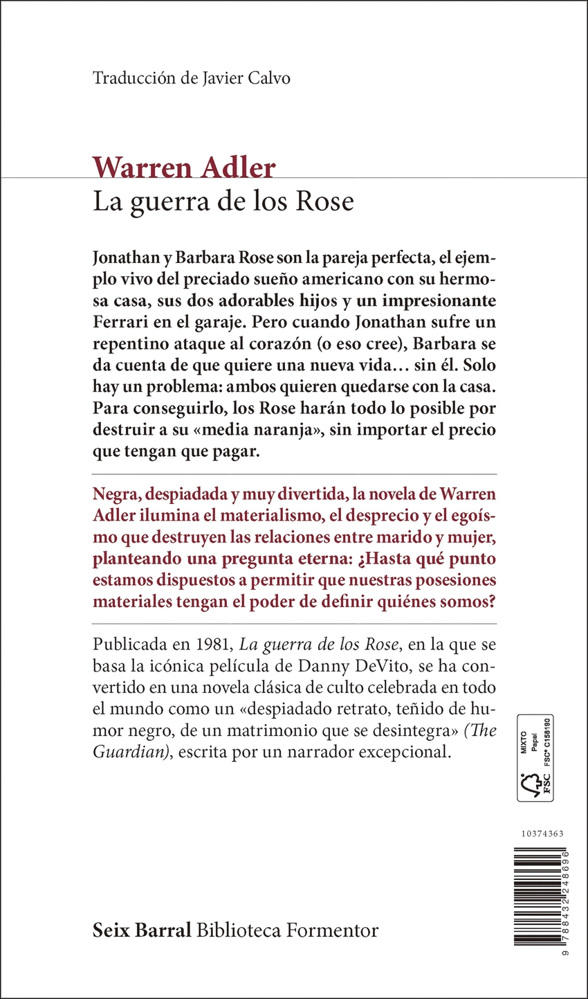 La novela en la que se basa una de las comedias más icónicas de la historia del cine. «Warren Adler escribe con una maestría que nos sumerge de lleno en la trama.» The New York Times Book Review «Una inteligente mirada a la ruptura de un matrimonio []. Tan aterradora como reveladora.» The Washington Star «Un despiadado retrato, teñido de humor negro, de un matrimonio que se desintegra.» The Guardian Jonathan y Barbara Rose son la pareja perfecta, el ejemplo vivo del preciado sueño americano con su hermosa casa, sus dos adorables hijos y un impresionante Ferrari en el garaje. Pero cuando Jonathan sufre un repentino ataque al corazón (o eso cree), Barbara se da cuenta de que quiere una nueva vida sin él. Solo hay un problema: ambos quieren quedarse con la casa. Para conseguirlo, los Rose harán todo lo posible por destruir a su «media naranja», sin importar el precio que tengan que pagar. Negra, despiadada y muy divertida, la novela de Warren Adler ilumina el materialismo, el desprecio y el egoísmo que destruyen las relaciones entre marido y mujer, planteando una pregunta eterna: ¿Hasta qué punto estamos dispuestos a permitir que nuestras posesiones materiales tengan el poder de definir quiénes somos Publicada en 1981, La guerra de los Rose, en la que se basa la icónica película de Danny DeVito, se ha convertido en una novela clásica de culto celebrada en todo el mundo como un «despiadado retrato, teñido de humor negro, de un matrimonio que se desintegra» (The Guardian) y escrita por un narrador excepcional.