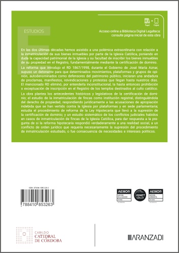 Hasta 2015, la Iglesia Católica podía inmatricular sus bienes en el Registro de la Propiedad usando la certificación de dominio, según el art. 206 de la Ley Hipotecaria. Este privilegio generó controversia, principalmente en el ámbito político. El libro explora los orígenes históricos y legislativos de este método de inmatriculación y examina la jurisprudencia vigente en las disputas sobre la propiedad de los bienes inmatriculados por la Iglesia.