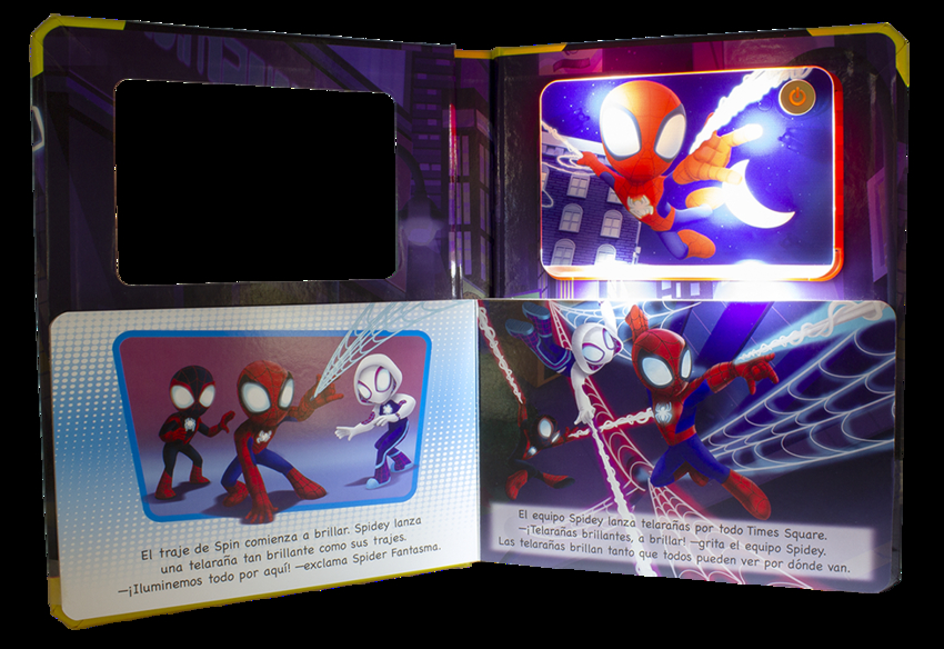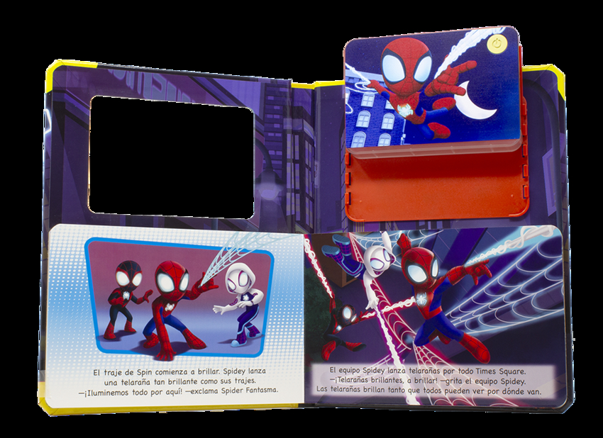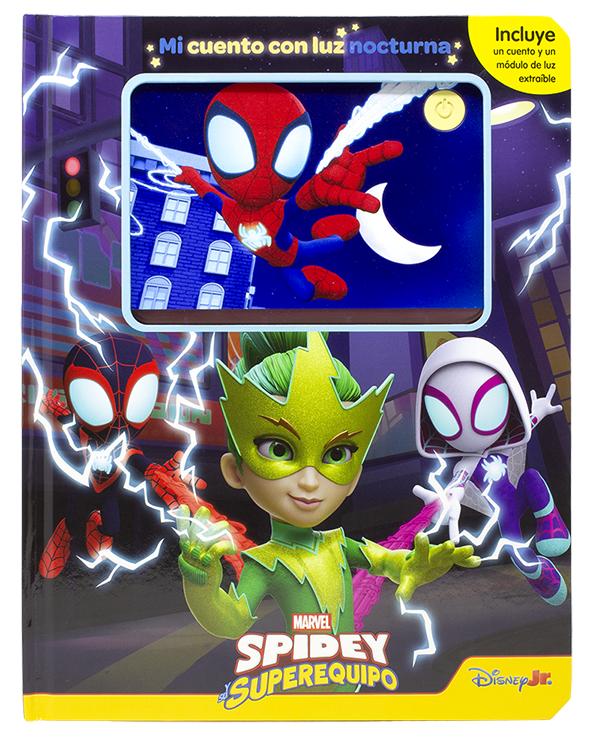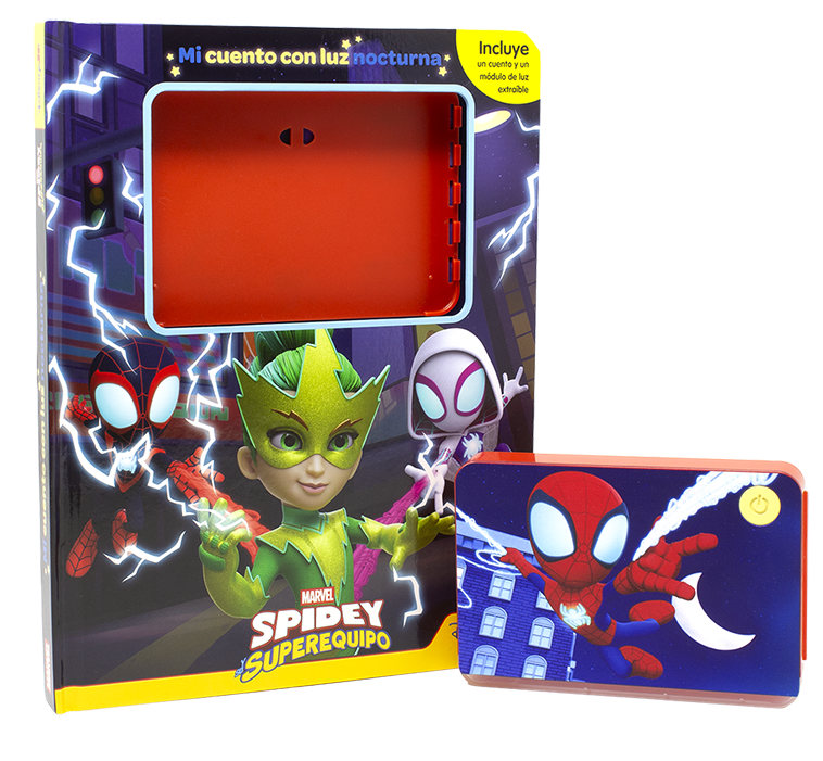 ¡Enciende la luz y tu imaginación antes de dormir con Spidey y su superequipo! Mi cuento con luz nocturna es un formato que incluye un módulo de luz nocturna extraíble que se apaga automáticamente a los cinco minutos, un soporte desplegable para el libro y un cuento que ayudará a los más pequeños a dormir bien.