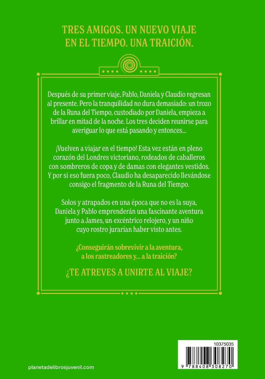Después de su primer viaje, Pablo, Daniela y Claudio están de vuelta a su época. Pero la tranquilidad no dura demasiado: un trozo de La Runa del Tiempo, custodiado por Daniela, empieza a brillar en mitad de la noche. Los tres deciden reunirse para averiguar lo que está pasando y entonces ¡Vuelven a viajar en el tiempo! Esta vez están en pleno corazón del Londres victoriano, rodeados de caballeros con sombreros de copa y de damas con elegantes vestidos. Y por si eso fuera poco, Claudio ha desaparecido llevándose consigo el fragmento de la Runa del Tiempo. Solos y atrapados en una época que no es la suya, Daniela y Pablo emprenderán una fascinante aventura junto a James, un excéntrico relojero, y un niño cuyo rostro jurarían haber visto antes. ¿Conseguirán sobrevivir a la aventura, a los rastreadores y a la traición ¿Te atreves a unirte al viaje *** ¿Por qué leer Una traición inesperada Porque la autora es Jara Santamaría, especialista en crear mundos fantásticos en sus novelas y atrapar con sus tramas trepidantes a lectores de a partir de diez años. Porque tiene los ingredientes para convertirse en una trilogía adictiva: aventuras, amistad, un viaje en el tiempo y objetos mágicos. Los protagonistas, Daniela y Pablo, tienen una química especial.