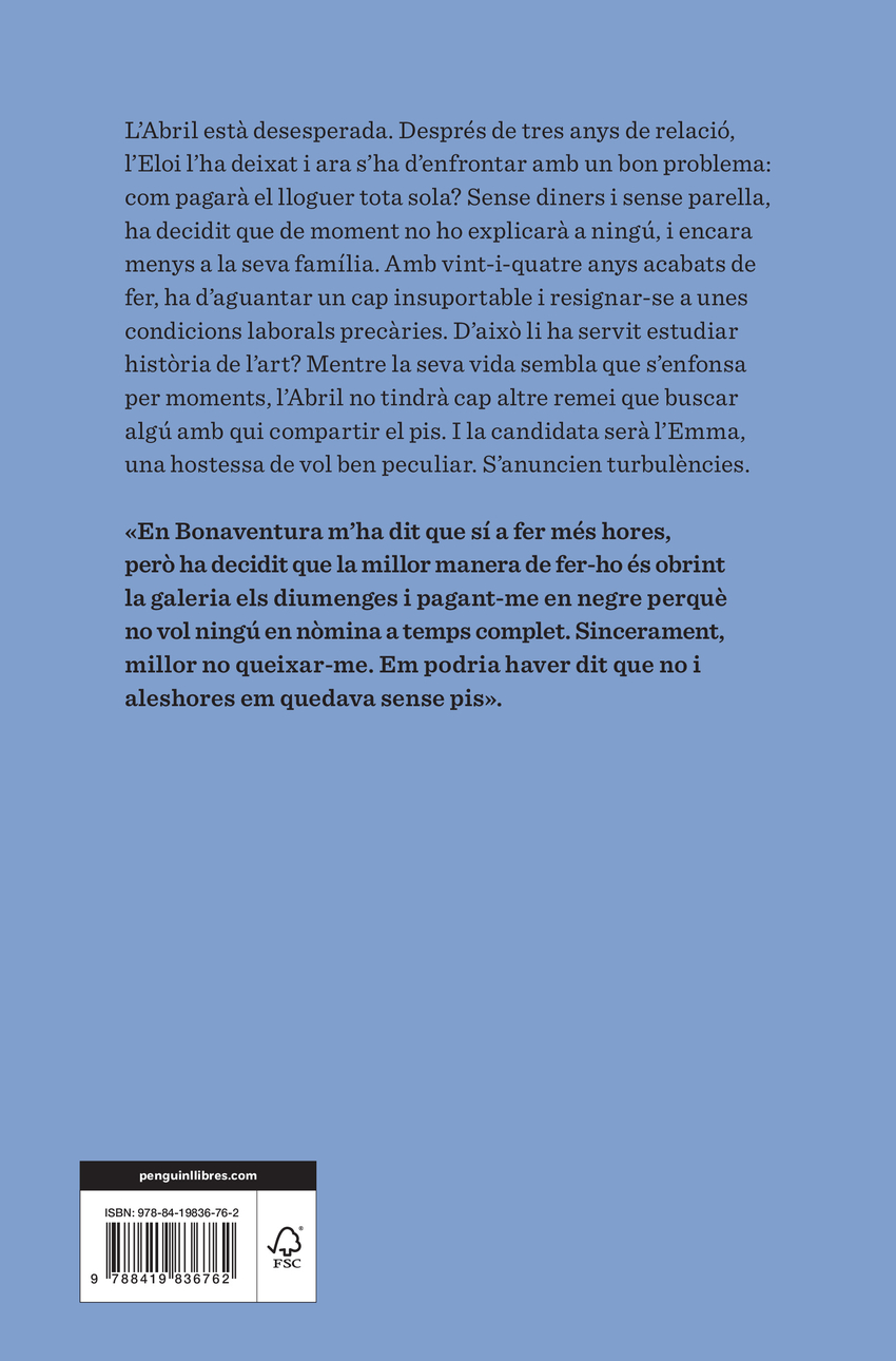 L'Abril s'enfrontarà amb humor als entrebancs de la vida al costat de la seva nova companya de pis. L'Abril està desesperada. Després de tres anys de relació, l'Eloi l'ha deixat i ara s'ha d'enfrontar amb un bon problema: com pagarà el lloguer tota sola Sense diners i sense parella, ha decidit que de moment no ho explicarà a ningú, i encara menys a la seva família. Amb vint-i-quatre anys acabats de fer, ha d'aguantar un cap insuportable i resignar-se a unes condicions laborals precàries. D'això li ha servit estudiar història de l'art Mentre la seva vida sembla que s'enfonsa per moments, l'Abril no tindrà cap altre remei que buscar algú amb qui compartir el pis. I la candidata serà l'Emma, una hostessa de vol ben peculiar. S'anuncien turbulències. Un debut literari irònic i pertit que gira al voltant de temes com la precarietat laboral, la crisi de l'habitatge a Barcelona, la descoberta de la sexualitat o la frustració de les expectatives vitals projectades. «En Bonaventura m'ha dit que sí a la pujada d'hores, però ha decidit que la millor manera de fer-ho és obrint la galeria els diumenges i pagant-me en negre perquè no vol a ningú en nòmina a temps complet. Sincerament, millor no queixar-me. Em podria haver dit que no i aleshores em quedava sense pis».